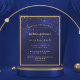 Una moderna y moderna tarjeta de invitación de cumpleaños número 50 (o cualquier edad) para hombres, hombres y hombres. Un fondo azul oscuro, azul marino. El color azul es desigual. Con un marco de oro falso y un confetti dorado rociado, letras de colores dorados. Personalice y agregue la información de su fiesta. Fondo azul con salpicadura de confeti.