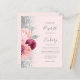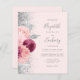 El borde izquierdo de esta elegante invitación de boda moderna presenta un ramo floral en tonos de borgoña y rosa desmayado, recortado con lámina de plata falsa y follaje de purpurina falsa y espolvoreado con purpurina falsa plateada. El texto personalizable combina la escritura a mano gris, la letra copperplate y las fuentes itálicas sobre un fondo rosa desmayado. Agregue detalles adicionales en el reverso, junto con un código QR para ayudar a sus invitados a visitar el sitio web de su boda.
