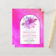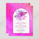 Flores PRESUPUESTARIAS y invitación a la boda en arco magenta rosa con código QR para RSVP. Este bonito diseño boda muestra un marco de arco sobre fondo de color rosa fucsia. En el marco hay una dalia y flores rosas, follaje y pasto de pampas. La parte posterior incluye el código QR en línea para RSVP.