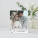 Gracias Boda De Fotografía De Recién Campesinos Gracias. Un precio económico menor 4,5" x 5,6" alternativa. Disponible en un ALMACENAMIENTO DE TARJETAS SEMI-GLOSS de 110 lb que es la opción predeterminada (más grueso para las invitaciones), O UN ALMACENAMIENTO DE PAPELES DELGADOS SATIN FINISH DE 80 lb (ideal para los gabinetes). Los sobres son un extra opcional y son algo más grandes que el tamaño de la tarjeta. Un diseño moderno de tipografía con un elegante guión estilo escritura a mano para Gracias de los Newlyweds puesto parcialmente en tu foto - simplemente reemplaza la imagen de muestra con la tuya propia. Personalice fácilmente el resto del texto en la parte delantera y posterior con su mensaje y nombres.