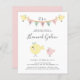 Una divertida invitación a una ducha de bebé con un presupuesto asequible, con un toque retro que incluye tipografía gris suave y dos pájaros bebés amarillos sosteniendo un cartel de naranja pastel, pancarta rosa y verde menta y anunciando "¡es un chica!" El nombre de la madre está escrito en un guión moderno. Un lindo pájaro mami amarillo que lleva a una pequeña chica rosa caminando juntos por encima de los detalles del fiesta. Se puede personalizar fácilmente con los detalles de la ducha.