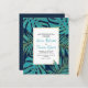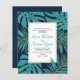 PRESUPUESTO verde azulado, azul marino y dorado de la monastera tropical y hojas de palma invitación de boda con código QR a RSVP en línea. Muestra un patrón de hojas tropicales en azul verde azulado con un contorno dorado sobre azul marino y tu texto en un marco blanco. La parte posterior incluye un patrón de puntos de polka oro sobre fondo marino y el código QR.