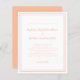 Elegante y de moda invitación a bodas de bajo coste, presenta un diseño minimalista contemporáneo sencillo con un borde doble de marco en color melocotón sobre un fondo blanco y nítido. La redacción tradicional proporciona sofisticación atemporal y moderna. Personalice el diseño boda con sus detalles en letras y guiones de melocotón de moda. La parte posterior de la tarjeta coincide con melocotón sólido.