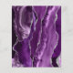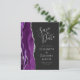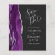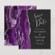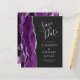 El borde izquierdo de esta elegante tarjeta moderna de guardar la fecha de la boda presenta un borde de ágata de acuarela morada recortado con brillo plateado falso. El texto personalizable combina la escritura a mano gris plateada y las fuentes copperplate sobre un fondo negro claro. El reverso presenta un diseño de ágata morada y plateada a juego.