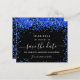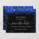 Un fondo negro decorado con un confeti azul real. Personalice y agregue una fecha y un nombre/edad. El texto: Save the Date se escribe con un gran guión de estilo escrito a mano.