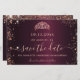 Una chica y de moda Salven la tarjeta de fecha para una fiesta de 15 años en Quinceañera. Un color de fondo burdeos de aspecto metálico. Decorada con rosa de oro falso polvo purpurina y una tiara, corona. El texto: Save the Date se escribe con un gran guión de estilo escrito a mano.