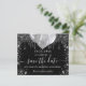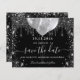 Una chica y de moda Salven la Fecha para una Quinceañera, fiesta de cumpleaños número 15. Un fondo negro decorado con tonalidades de purpurina plateado gotea, chispas y globos. Personalice y agregue una fecha y un nombre/edad. El texto: Save the Date se escribe con un gran guión de estilo escrito a mano.
