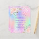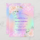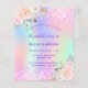 Una quinceañera femenina y femenina, 15ª invitación a la fiesta de cumpleaños. En el frente: fondo de color arcoiris y holográfico en color morado, rosa, verde menta, oro rosa. Decorada con purpurinas falsos de color rosa oscuro, chispas. Personalice y agregue un nombre y detalles del fiesta. El nombre está escrito con un guión de estilo con letras a mano, letras de color púrpura.