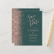 El borde izquierdo de esta elegante y moderna boda, salvo la tarjeta de fecha, incluye un rosa de purpurina de imitación de oro. El texto del personalizable combina la escritura de color dorado subió pálido, la copperplate y las letras cursivas sobre un fondo verde oscuro. El reverso presenta un diseño a juego de color verde oscuro y oro rosa.