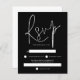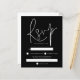 Una alternativa de valor por dinero BUDGET en un tamaño menor de 4,5 x 5,6" de peso semibrillante de 110 libras, que es de espesor similar al de una postal (sin embargo, no es adecuado para usar como postal). POR FAVOR, TENGA EN CUENTA QUE HAY UNA invitación por hoja. Presupuesto Sencillo Texto Blanco Matrimonio Negro RSVP. Una tipografía elegante está en la parte superior del encabezamiento principal RSVP, complementando el resto del texto que puede personalizar fácilmente.