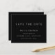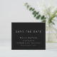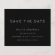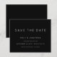 Simple Tipografía Matrimonio Blanco Negro Salva La Fecha. Un precio económico menor 4,5" x 5,6" alternativa. Disponible en un ALMACENAMIENTO DE TARJETAS SEMI-GLOSS de 110 lb que es la opción predeterminada (más grueso para las invitaciones), O UN ALMACENAMIENTO DE PAPELES DELGADOS SATIN FINISH DE 80 lb (ideal para los gabinetes). Los sobres son un extra opcional y son algo más grandes que el tamaño de la tarjeta. Totalmente personalizable. .Se muestra aquí en blanco sobre negro, sin embargo el texto y los colores de fondo se pueden cambiar si se desea a través de la opción personalizar.