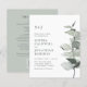 Presupuesto todo en una invitación a la boda de eucalipto botánico... Nuestra asequible invitación a bodas botánicas "All in One" cuenta con una elegante rama de acuarela de eucalipto en tonos de salvia y verde polvoriento que le da el texto de la invitación a su lado. El sabio ligero de la invitación contiene todos los detalles que normalmente se verán en tarjetas separadas dentro del paquete boda. Esta moderna invitación a la boda, tanto en el frente como en la espalda, ha sido diseñada para ser elegante y para tener en cuenta el presupuesto... sin hablar de ahorrar tiempo. En la parte posterior también hay una plantilla de gráfico de código QR que puede reemplazar con su propio código (o eliminar si no tiene previsto usar uno). Todo el texto de ejemplo se puede revisar fácilmente con su propia información sobre la plantilla de personalización. Todo esto en un solo diseño de presupuesto también está disponible en una tradicional tarjeta de invitación a bodas 5x7.