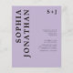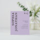 Presupuesto todo en uno con detalles de la moderna negrita tipografía en negro sobre la invitación a la boda monográfica pastoral púrpura... Nuestra asequible invitación a bodas negras "All in One" en color púrpura pastel presenta una tipografía en negrita en sans serif negro combinada con un texto en sans serif para una simple y moderna invitación a una boda monogramada. La parte posterior de la invitación contiene todos los detalles que normalmente se verán en las tarjetas separadas del paquete del boda, incluyendo la hora y el lugar de recepción, las opciones de alojamiento, el sitio web del boda, RSVP e información del registro. Esta invitación a la boda de estilo moderno ha sido diseñada para ser a la vez moderna y de bajo coste. Todo el texto de ejemplo se puede revisar fácilmente con su propia información sobre la plantilla de personalización. Tenga en cuenta que tiene la opción de comprar sobres con sus invitaciones o de comprar los suyos propios, si tiene un proveedor de productos de papel preferido.