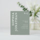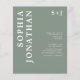 Presupuesto todo en uno con detalles de la moderna tipografía negrita Invitación a la boda del Monograma Verde Sage... Nuestra asequible invitación a bodas verdes "All in One" incluye una tipografía serif audaz combinada con un texto sans serif para una simple y moderna invitación a una boda monogramada. La parte posterior de la invitación contiene todos los detalles que normalmente se verán en las tarjetas separadas del paquete del boda, incluyendo la hora y el lugar de recepción, las opciones de alojamiento, el sitio web del boda, RSVP e información del registro de regalos. Esta invitación a la boda de estilo moderno ha sido diseñada para ser a la vez moderna y de bajo coste. Todo el texto de ejemplo se puede revisar fácilmente con su propia información sobre la plantilla de personalización. Tenga en cuenta que tiene la opción de comprar sobres con sus invitaciones o de comprar los suyos propios, si tiene un proveedor de productos de papel preferido.