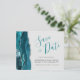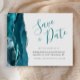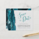 Este elegante presupuesto ahorra la tarjeta de fecha presenta un borde de agujeros de color azul verde azulado recortado con falso purpurina de plata. El texto del personalizable combina el guión de escritura a mano azul verde azulado con el copperplate gris de carbón y los tipografías cursivas en un fondo gris pálido. El reverso presenta un diseño de ágata verde azulado y plateado a juego.