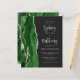 El borde izquierdo de esta elegante invitación de boda moderna presenta un borde de ágata de acuarela en verde cazador recortado con brillo plateado falso. El texto personalizable combina la escritura de caligrafía gris plateada clara y la fuente sans serif sobre un fondo negro apagado. El reverso presenta un diseño de ágata verde y plateado a juego.