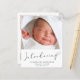 Un simple y lindo anuncio de natalidad sin prejuicios sexistas y respetuoso con el presupuesto. La parte delantera incluye la foto del recién nacido, el nombre completo, la fecha de llegada y las estadísticas de nacimiento, y "Introducing" en un guión elegante que termina con un corazón florido. En el reverso puedes añadir otras tres fotos, nombres de padres y hermanos y un mensaje de agradecimiento, visita u otro.