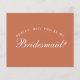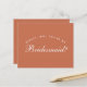 Una simple y minimalista propuesta de dama de honor que también comunica el color boda de los vestidos de dama de honor: terracota. Se trata de un texto blanco sobre fondo de terracota (marrón), de un color moderno. La palabra Bridesmaid en la parte delantera y el mensaje en la parte posterior están escritos en un guión caligráfico elegante, el texto en arco "[Nombre] será mi" encima de la palabra Bridesmaid en mayúsculas pequeñas.