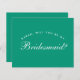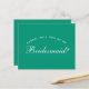 Una simple y minimalista propuesta de dama de honor que también comunica el color boda de los vestidos de dama de honor. Es sólo un texto blanco sobre fondo verde esmeralda (un color moderno, popular para los vestidos de dama de honor). La palabra Bridesmaid en la parte delantera y el mensaje en la parte posterior están escritos en un guión caligráfico elegante, el texto en arco "[Nombre] será mi" encima de la palabra Bridesmaid en mayúsculas pequeñas.