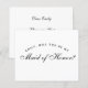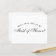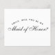 Una propuesta simple y minimalista de dama de honor: solo texto negro sobre fondo blanco. Las palabras Dama de Honor en la parte frontal y el mensaje en la parte posterior están escritos en una elegante letra caligráfica, el texto arqueado "[Nombre] ¿serás mi" en mayúsculas pequeñas.