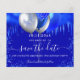 Un fondo de color azul real a la moda, decorado con goteos azules reales, confeti y globos. Personalice y agregue una fecha y un nombre/edad. El texto: Save the Date se escribe con un gran guión de estilo escrito a mano.