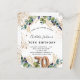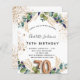 Para una fiesta de cumpleaños número 70. Un fondo blanco decorado con vegetación eucaliptos y hojas doradas. Lugares purpurinas de imitación dorada. Personalice y agregue sus nombres y detalles del boda. Letras de color negro y dorado. El número 70 se escribe con el tipo de letra de estilo globo. Parte posterior: fondo blanco y puntos purpurinas falsos dorados.