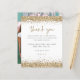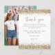 Purpurina de oro Script Photo Bridal Shower Gracias. Un precio económico menor 4,5" x 5,6" alternativa. Disponible en un ALMACENAMIENTO DE TARJETAS SEMI-GLOSS de 110 lb que es la opción predeterminada (más grueso para las invitaciones), O UN ALMACENAMIENTO DE PAPELES DELGADOS SATIN FINISH DE 80 lb (ideal para los gabinetes). Los sobres son un extra opcional y son algo más grandes que el tamaño de la tarjeta. Las fronteras de los falsos purpurinas de oro están en la parte superior e inferior del frente, y Gracias está en un guión de estilo de escritura a mano en la coordinación del oro. Personaliza fácilmente el resto del texto. En la parte de atrás, reemplace la muestra ;pic con su propio favrite de todos en su evento. También puede cambiar el texto y los colores de fondo a través de la opción personalizar adicional si lo desea.