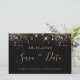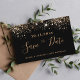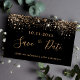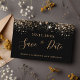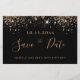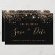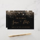 Una chica y de moda Guardar la tarjeta de fecha para una fiesta de cumpleaños número 40 (o cualquier edad). Un fondo negro decorado con un falso purpurina dorado. Plantillas para una fecha y nombre y texto. Letras de colores dorados. El texto: Save the Date se escribe con un gran guión de estilo escrito a mano.