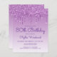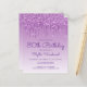 Esta invitación a la fiesta de cumpleaños número 80 de la moda presenta un purpurina falso y morado negro brillante. Las palabras "80th Birthday" y el nombre del invitado de honor aparecen en un guión informal de escritura a mano morada, con el resto del texto del personalizable en letra sans serif. El mismo diseño de goteo purpurina morado aparece en el reverso.