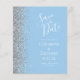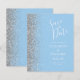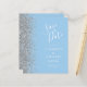 El borde izquierdo de esta elegante y moderna boda, salvo la tarjeta de fecha, cuenta con un purpurina falso plateado. El texto del personalizable combina la escritura a mano blanca y los tipos de letra de copperplate en un fondo azul bebé pastel. El reverso presenta un diseño azul y plateado a juego.