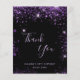Una tarjeta de agradecimiento por un cumpleaños número 50 (o cualquier edad). Color de fondo negro, decorado con un falso purpurina morado. En el frente del guión con letras a mano y el texto: Gracias, tu texto, título y una fecha. Atrás: Personaliza y agrega tu nota de agradecimiento y nombre.