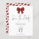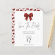 Purpurina Rojo Presupuesto Coquette Bow Navidades Fiesta Guardar la fecha. Precio económico, tamaño menor de 4,5 x 5,6" semi brillo similar en grosor a una postal. Hay UNA por hoja, Esparkle para invitar a sus invitados festivos con una falsa reverencia purpurina y coordinando el pattren al otro lado sobre negro clásico. Un guión elegante e informal para Guardar la fecha y el resto del texto que puede personalizar fácilmente.