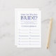 Esta sencilla, minimalista y moderna hoja de juego de "¿Qué edad tenía la novia?" de color azul marino es perfecta para cualquier fiesta de regalos. Este juego divertido y fácil seguramente traerá muchas risas a cualquier celebración. Pida a familiares y amigos que le envíen fotos de la novia a diferentes edades y hágales imprimir. Numérelas y colóquelas cerca de estas hojas de juego. Simplemente dé una hoja a cada invitado (no olvide los bolígrafos) y deje que comience la competencia. Te sorprenderá cuánta gente realmente conoce las edades de la novia. En segundos puedes ver cómo se verá tu hoja de juego. Simplemente seleccione Personalizar esta plantilla y escriba el nombre de la novia.