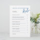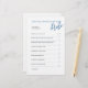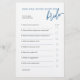 Este elegante juego de ducha de novias es una forma divertida de celebrar a la futura novia. Con un guión azul clásico y un diseño minimalista suave, los huéspedes podrán responder a 15 preguntas personales de la tribu para ver quién conoce mejor a la novia. 💍 Doble cara, 💙 Coordinación con nuestra colección "Pop the Bubbly", ✨ Perfecto para duchas nupales, solteras y brunches