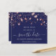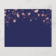 Un Save the Date femenino y moderno para una Quinceañera, fiesta de cumpleaños número 15. Un fondo azul marino con estrellas de rosa dorado. El texto: Save the Date está escrito con una fuente manuscrita de estilo moderno y letras grandes. Letras de color gris claro.