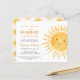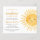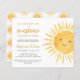 Invite a su familia y amigos a su ducha de bebé con temática solar con esta tierna invitación a la ducha de bebé. Presenta el texto "Un pequeño rayo de sol está casi aquí" en una tipografía elegante con un bonito sol de color amarillo. La parte trasera está decorada con un patrón de sol sonriente. Personalizable fácil. Porque creamos nuestra obra de arte no encontrarás esta imagen exacta de otros diseñadores. Acuarela original © Michele Davies.