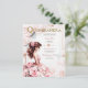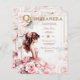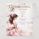 Disfrute de la escena con esta hermosa Invitación Quinceanera que incluye texto para la ceremonia, recepción, rsvp y detalles que se pueden añadir al reverso.
