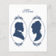 Delicadas rosas azules y blancas con acentos de estilo Bridgerton Regency rodean dos cameos clásicos de una hembra y el otro macho, todo ello con un fondo blanco y nítido.