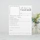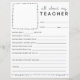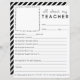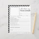 Un divertido regalo de agradecimiento a los profesores al final del año escolar para darle las gracias a los profesores. Esto es todo sobre mi profesor que rellena la carta en blanco con espacio para que tu hijo escriba a mano y una flecha en blanco para escribir o dibujar algo. La parte de atrás de este regalo de la carta del profesor es un blanco rayado y negro. Esto haría que un profesor lindo se quedara con él. Por favor, echen un vistazo a mi colección de regalos para profesores para más ideas.
