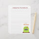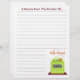 Papel recetario con líneas opcionales, que se puede eliminar. En la parte inferior hay un ilustracion de una estufa verde de inspiración retro con una olla naranja en el quemador delantero izquierdo. El texto superior dice "Una receta de la cocina de...". Personaliza tu nombre por encima de la estufa en la parte inferior. Buscar el enlazador de recetas correspondiente