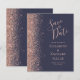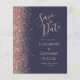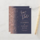 El borde izquierdo de esta elegante y moderna boda, salvo la tarjeta de fecha, incluye un rosa de purpurina de imitación de oro. El texto del personalizable combina la escritura de color dorado subió pálido, la copperplate y las letras cursivas en un fondo azul oscuro. El reverso presenta un diseño a juego de azul oscuro y oro rosa.