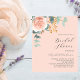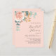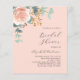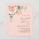 Un fondo de color melocotón a la moda. Decorada con rosa de oro y floral rosa, flor rosa y hojas de eucalipto de color verde acuático, brotes, vegetación y una falsa primavera dorada. Personalice y agregue el nombre de la novia para ser y los detalles del fiesta. Fondo de color melocotón. 1 hoja = 1 borde impreso de invitación al borde.
