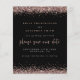 Una alternativa de valor por dinero BUDGET en un tamaño menor de 4,5 x 5,6" de peso semibrillante de 110 libras, que es de espesor similar al de una postal (sin embargo, no es adecuado para usar como postal). POR FAVOR, TENGA EN CUENTA QUE HAY UNA invitación por hoja. Rosa Purpurina Oro Bordes Guión Boda Negro Guardar La Fecha. El purpurina Rosa Gold falso bordea los bordes superior e inferior de cada lado y un guión elegante para Guardar nuestra fecha. Personaliza fácilmente el resto del texto a tus detalles.