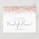 Rosa de presupuesto Purpurina de oro Script Maid of Honor Request. Un precio presupuestado 4,5" x 5,6" alternativo. Disponible en un SEMI GLOSS de 110 lb CARD STOCK que es la opción predeterminada (más grueso para las invitaciones) Maid of Honor se encuentra en un guión elegante en el centro. Un borde de falso purpurina de oro rosa está en la parte superior de cada lado.