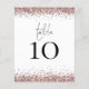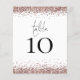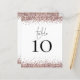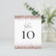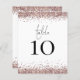 Un tamaño de 4,5 x 5,6" de peso semibrillante de 110 libras, que es de un grosor similar al de una postal, con una por hoja. Tabla De Bodas Rosas Purpurinas De Oro Sin Blanco. La tabla se encuentra en un script de estilo de escritura a mano establecido y su número de tabla debajo con bordes purpurinas falsos. Personaliza fácilmente el número. El mismo diseño está en la parte trasera.