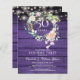 Con una delicada acuarela de vegetación floral y luces de cuerdas de bonito en un fondo de paneles de madera violeta, esta moda rústica sorpresa fiesta 50 aniversario de boda invitación a los huéspedes a que se personalicen con su información especial sobre el aniversario de oro. El reverso presenta una guirnalda floral que enmarca las fechas del aniversario en un elegante texto blanco sobre un fondo de paneles de madera. Diseñado por Thisisnotme©