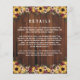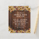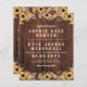 Invitación rústica de dos en una boda de presupuesto impresa en un papel más delgado con girasoles, y flores de color rubia y borgoña, y bayas y brotes contra un estampado de madera cálida. Añade tus nombres y frases de invitación a la boda con letras rústicas. En la parte posterior, agregue los detalles de su boda como alojamiento, sitio web, cómo RSVP o cualquier otra cosa que necesite.