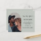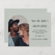 On front: Add your own vertical size photo inside the arch photo frame. A trendt muted sage green background, black text. Templates for names and the date. The name and the text: Save the Date are written with a modern hand lettered style script with a heart.
