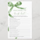 Juego "Who Knows The Bride Best" (Quién conoce a la mejor novia) de Sage Green Bow - Añada algo de diversión a su ducha de novia con esta encantadora tarjeta de juego que presenta un delicado diseño de arco verde sabio. Este juego "Who Knows The Bride Best" es perfecto para atraer invitados y celebrar a los futuros novios con estilo. Con escritura elegante y acentos femeninos, esta tarjeta de juego es una bella adición a cualquier tema de ducha de novia, lo que lo hace un recuerdo memorable para la novia y sus seres queridos. *** Por favor introduzca H144 en la búsqueda de la tienda para encontrar todos los elementos coincidentes *** O visite nuestra colección Sage Green Bow. *** Este diseño de alta calidad es fácil de personalizar para que coincida con tus colores, estilos y temas de la ducha. Para una mayor personalización, haga clic en el enlace "Editar usando la herramienta de diseño" y utilice nuestra herramienta de diseño para modificar esta plantilla. Si necesita ayuda o elementos coincidentes, por favor contáctame.