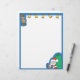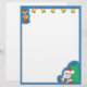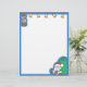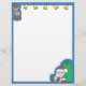 Este membrete personalizado tiene un reno y cinco campanas de oro en la parte superior, Santa Claus sentado con una gran bolsa de juguetes en la esquina inferior derecha y un borde azul.
